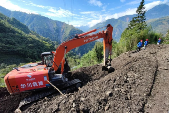 在第三、四塌方點搶通完成后,搶險隊伍立即趕往下一處搶通點。此處塌方位于聯(lián)合村三組大回頭彎,初步估計塌方量達10萬方,因山體滑坡致使路基全毀,車輛人員均無法通行,且該段道路為環(huán)形道路,搶險難度極大、風(fēng)險高且耗時長。經(jīng)前線指揮部、甘孜州交通運輸局、設(shè)計院專家、集團前線搶險隊現(xiàn)場勘察共同研判決定,從另一方的開辟一條新道路至滑坡處,盡快搶通此路段。按照方案要求,搶險隊伍立即組織人員及設(shè)備轉(zhuǎn)場,全力推進搶通進度。