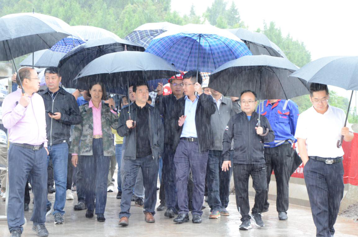 9月17日,集團黨委書記、董事長、總裁謝應文、常務副總裁駱曉紅等領導率集團各職能部門負責人,在營達項目向年底通車目標發(fā)起總攻、決戰(zhàn)決勝的關鍵時刻,冒雨深入營達高速項目施工一線現(xiàn)場督導慰問。營達公司總經理謝應武及參建單位負責人等陪同。