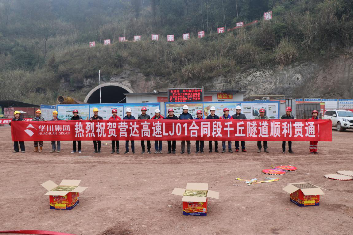 2018年12月19日12:20分,營達高速公路營達一標千丘隧道最后一炮聲響從正在施工的隧道內傳出,待隧道內煙塵散去,隧道兩頭的施工工人成功“會師”,至此,營達高速公路LJ01標第二座隧道 — 千丘隧道全線順利貫通!