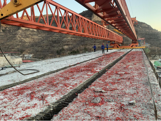 12月4日,伴隨著鞭炮聲與禮花聲,拐里大橋的最后一片40米箱梁宣告圓滿架設(shè)完成。